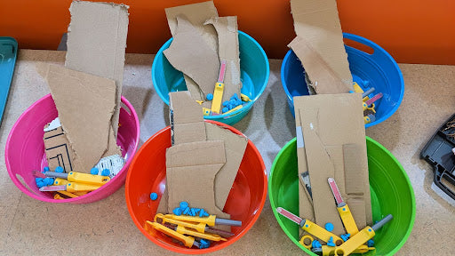 Just one week into our building and I noticed that the Makedo tools themselves needed more monitoring and organization. To solve for this, I divided the tools between five pencil boxes. (I have five tables for students in my room.) I then took screenshots of the tools and created a photo guide as to what should be in the supply box. This allowed groups to check their box at the beginning and end of each working session. It absolutely helped with keeping the groups more accountable for their tools.